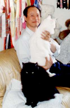 真っ白と真っ黒なメインクーンです。白い猫はフロスティ君で、3rd ShowでTICAの SGC(Supreme Grand Chanpion)、そして なんと1Showで CFAのGRCになりました。 (それぞれ各愛猫団体の最高位です。) 真っ黒な猫はあんこ嬢です(ショーグンの娘です)。 顔がよくわかんないですね。後ろの壁はロゼットの山。 SGC.RW. Koontucky July Frost of Williamina Williamina Anko |