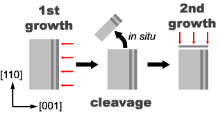 右の図がT型量子細線の作製手順を示したものです。 まず始めにMBE装置を使ってGaAs基板の(001)面に量子井戸を作製します。赤い矢印が分子線を表しています。 また、色が薄いほどポテンシャルが低い(バンドギャップエネルギーが小さい)ことに対応しています。この[001]方向の成長のことを第一成長と呼んでいます。 第一成長が終わった試料は一度MBE装置から取り出され、へき開傷を入れた後に再びMBE装置内へと配置されます。 この際、(110)面が蒸着源の方に向くように配置します。 そしてMBE装置内でへき開を行い、そこに(110)量子井戸を作製します。これはへき開再成長法と呼ばれる手法で、高真空内でへき開することでへき開面の 酸化を防ぐことが出来ます。この工程を第二成長とも呼びます。 |