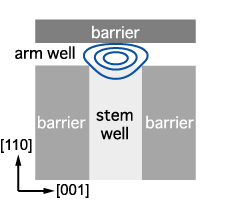 第一成長で作られる(001)量子井戸をTの字の幹という意味で"Stem well"、 へき開再成長で作られる(110)量子井戸をTの字の腕という意味で"Arm well"と呼んでいます。 青線は有限要素法によって計算された電子の存在確率を表しており、Tの字の部分に電子が閉じ込められていることがわかります。 |